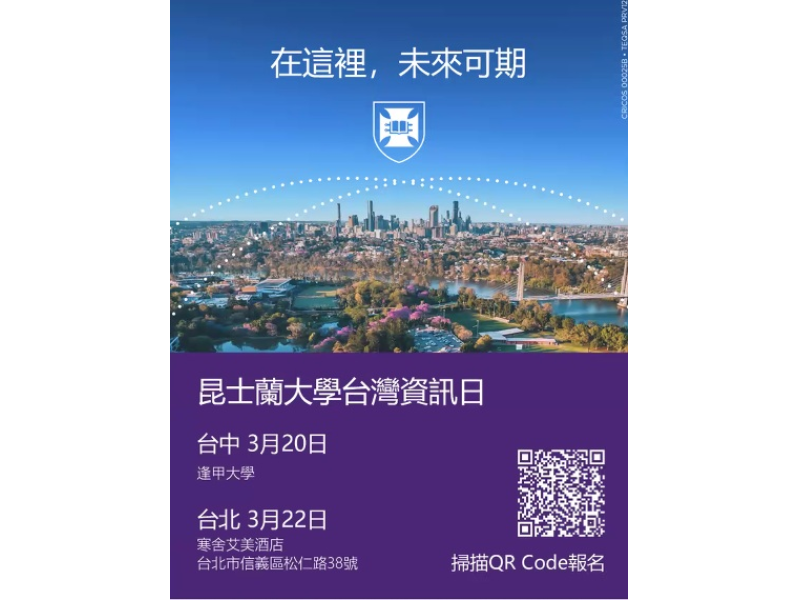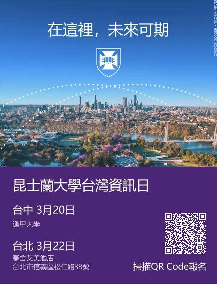 報名註冊 https://study.uq.edu.au/events/uq-info-day-taiwan?utm_source=agent&utm_medium=referral&utm_campaign=int-taiwan-info-day&utm_term=lian