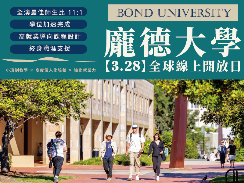 在快速變動的時代,Bond University 將帶你重新定義大學學習體驗,進入一所真正重視「個人發展」與「就業競爭力」的國際大學!