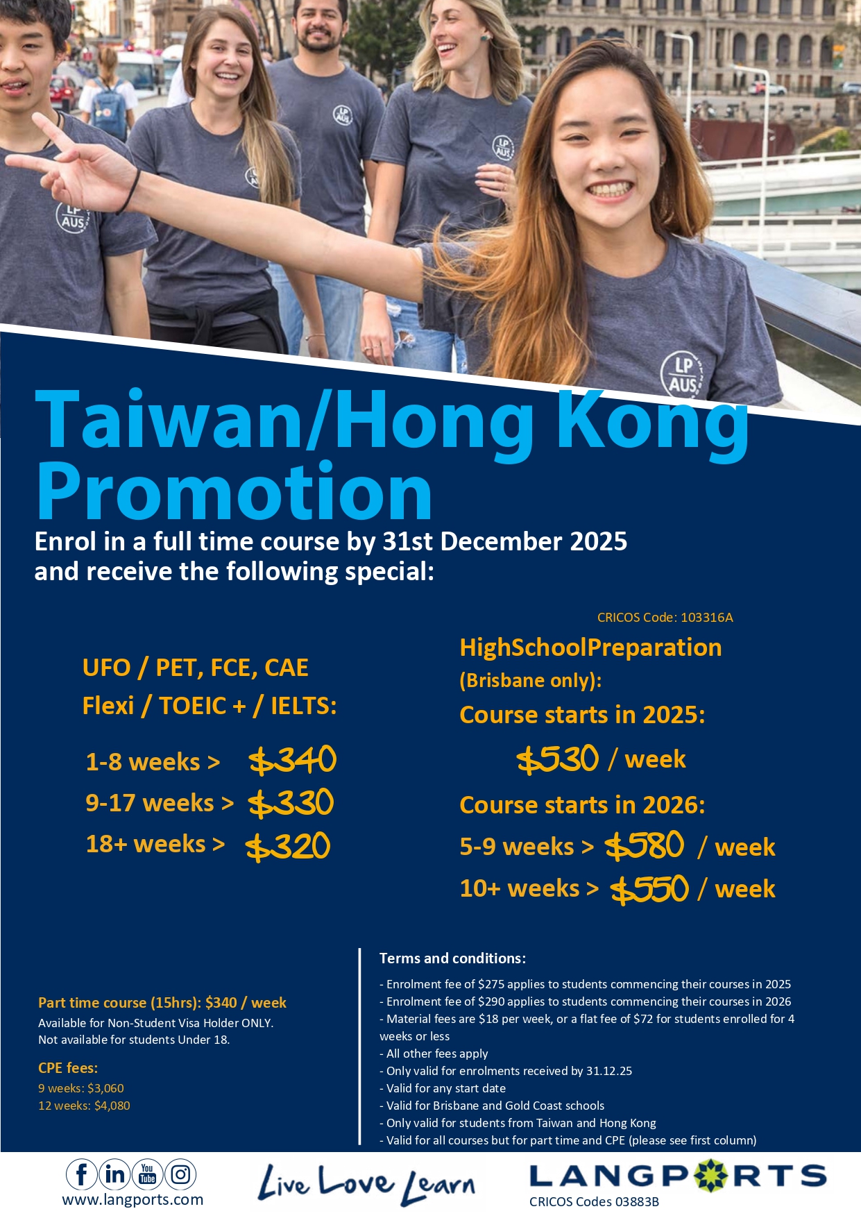 ☆ 報名 18 週以上英文課程:學費折扣 每週澳幣 320 元